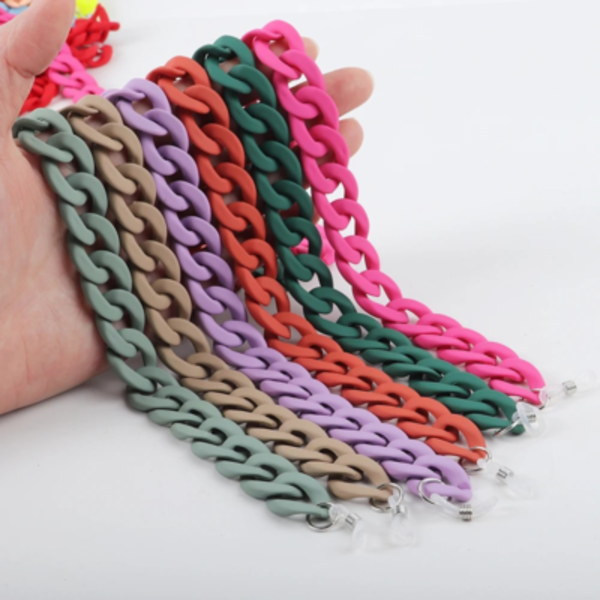 Akrylová retiazka na okuliare - dostupná v 18 farebných variantoch. Retiazka je na oboch stranách zakončená gumovou karabínkou (v balení sú 2x čierne a 2x biele gumové karabínky). Nataviteľný upínací prvok umožňuje retiazke zapadnúť do všetkých okuliarov. Možno použiť ako retiazku na slnečné a dioptrické okuliare alebo ako náhrdelník či náramok (gumička na pripevnenie k okuliarom je snímateľná).